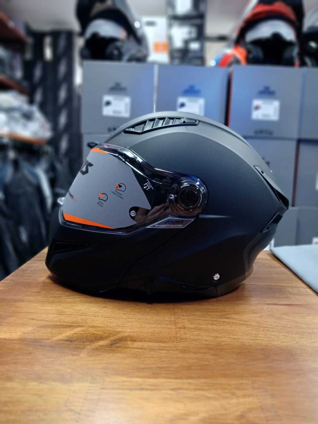 El Ghostfighter SV cuenta con una calota de alto rendimiento fabricada en HIRP (High Impact Resistant Polymer), que ofrece máxima resistencia con un peso ligero y confortable. La mentonera puede bloquearse de forma segura en posición abierta, lo que lo hace ideal para un uso modular.